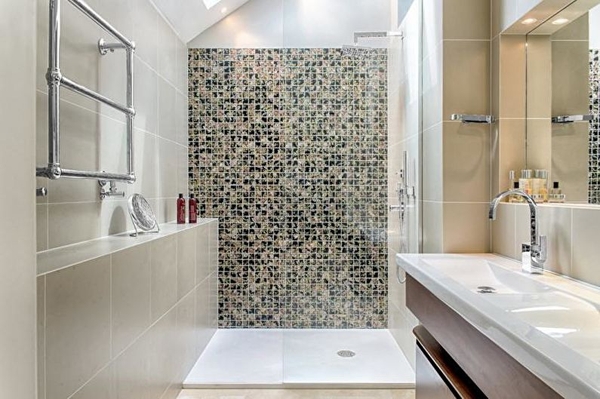 Bề mặt khảm trông tuyệt vời trên các bức tường trong phòng tắm và trên các mặt phẳng phòng tắm riêng lẻ. Hãy sáng tạo và tìm gạch có kích thước và hình dạng phù hợp - chúng chắc chắn sẽ trang trí cho một không gian được trang trí theo bất kỳ phong cách nào.