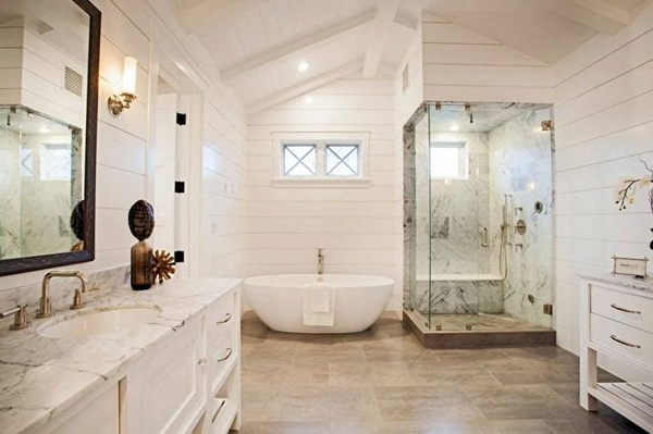 Đá tự nhiên là một yêu thích khác để trang trí phòng tắm. Nó bền và mạnh mẽ. Đại diện ngoạn mục và cao quý nhất của nó, tất nhiên là đá cẩm thạch. Các bề mặt được lót bằng nó trông vô cùng thanh lịch và sang trọng. Chúng ta đều biết rằng đây là một vật liệu đắt tiền, nhưng nó chắc chắn là giá trị đầu tư. Nó cũng có thể được thay thế bằng đồ đá sứ cao cấp với giả đẹp.