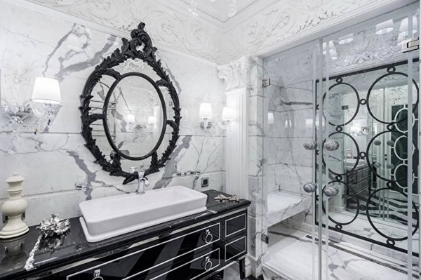 Phong cách truyền thống sang trọng nhưng đồng thời cũng quý phái và kín đáo. Sơn một phòng tắm như vậy với màu trắng sữa, kem, tinh tế màu xanh lam, hồng, đào, cá hồi, màu xám dịu.